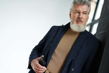 Attractive grey haired middle aged man in business casual wear looking away, holding smartphone, leaning on the wall while posing against white background