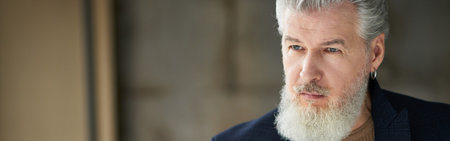 This portrait captures a mature man with distinguished silver hair and a well-groomed beard, exuding confidence and elegance with a serene expression outdoors.