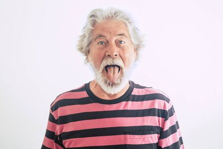 Nice and rare people old mature expression in portrait - fun with on limit age concept - mature male show his tongue with crazy hair and face - cute handsome male funny retired lifestyle