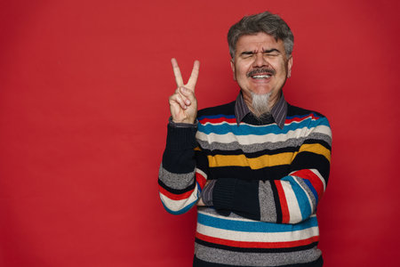 Mature man with grey beard showing peace sign and laughing isolated over red background