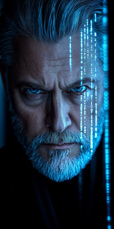 Binary Hacker Senior Man s Portrait with Double Exposure Effect in Cybersecurity Technology Concept