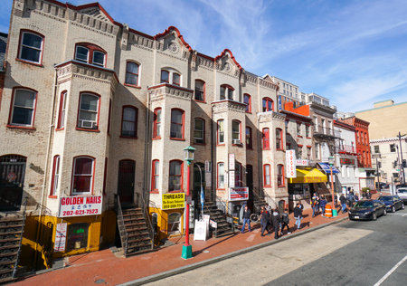 WASHINGTON DC, USA – MAY 9, 2015: Row houses and businesses in Adams Morgan neighborhood on a perfect spring day with young people walking on the street.