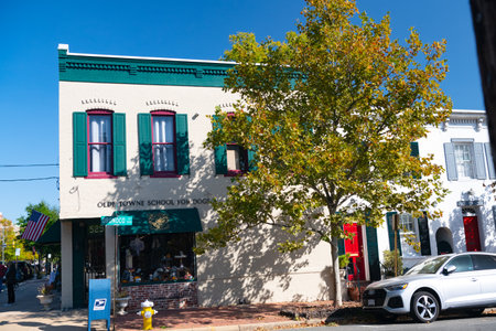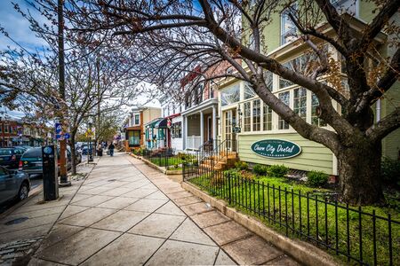 central street of the ancient town near Washington. Ancient buildings of shops, hotels and restaurants., strolling tourists.