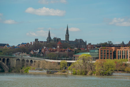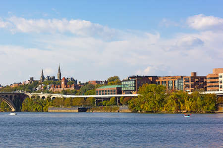 Georgetown waterfront suburb in Washington DC with a view on university historic buildings. Potomac River near Key Bridge with kayaks and motorboats.