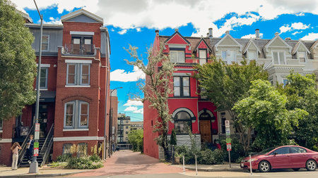 Washington D.C., USA, May 24, 2025. A narrow alley runs between historic red and white rowhouses on a leafy urban street corner.