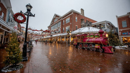 A picturesque street scene with a vintage train, adorned with festive decorations, under a gentle snowfall.