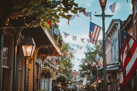 American flags waving outdoor on main street on memorial day for honoring for 4th July, Labor Day