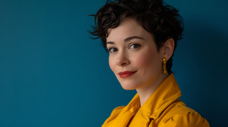 a woman with short curly hair wearing a yellow jacket