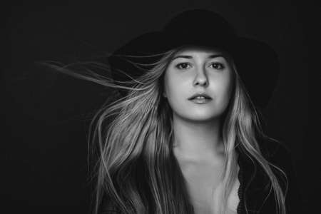 Beautiful blonde woman wearing a hat, artistic film portrait in black and white for fashion campaign and beauty brands