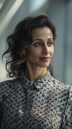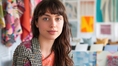 Beautiful woman stands proudly with an air of confidence in a chic ensemble