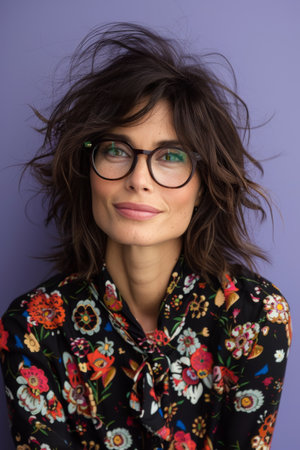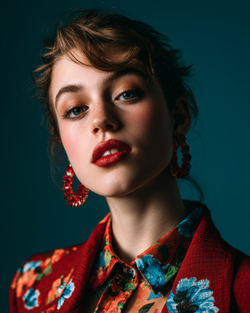 Portrait of a woman with stylish earrings and floral attire against a dark blue background