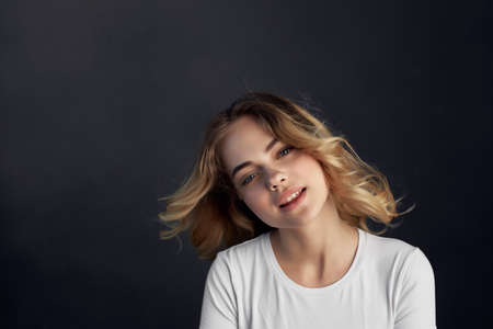 pretty woman in white t-shirt fashion studio posing