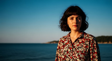 A young woman in a floral shirt standing by the ocean