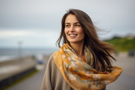 Portrait close up of young beautiful brunette woman in yellow scarf on the street