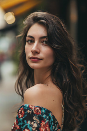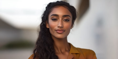 A young woman with long wavy hair stands confidently wearing a stylish outfit. The bright background suggests a sunny day highlighting her peaceful expression and poise.