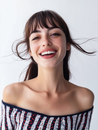A cheerful young woman with long, flowing hair laughs joyfully while wearing a relaxed, off-the-shoulder top in a neutral setting, radiating warmth and positivity.
