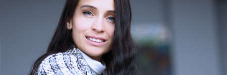 Beautiful smiling woman with clean skin, natural make-up on grey background