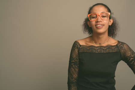 Young beautiful African woman against gray background