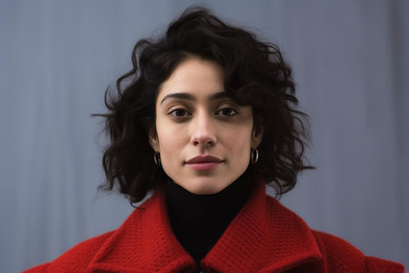 A photographic masterpiece perfect for fashion editorials, lifestyle magazines, or a personal portfolio showing style and individuality | This image features a calm and composed young woman, exuding elegance and confidence. The portrait focuses on her facial features with a particularly strong emphasis on her expressive eyes, which are filled with a serene yet engaging presence. The rich texture of her wavy hair wraps her face beautifully, adding a natural frame to the image. She sports a stylishly bold red overcoat with a classic black turtleneck underneath, creating a striking color contrast that commands attention and signifies a blend of modern fashion sensitivity and timeless sophistication. Her minimalist earrings complement the simplicity and understated chic of her ensemble. The neutral gray background ensures that all the attention remains on her, while the natural light caressing her face highlights her complexion with soft, even tones. The overall effect is one of quiet intensity and self-assurance | An ideal representation for articles on contemporary fashion trends, branding for clothing lines, or as an illustrative image in stories about strong and poised individuals. This portrait can also inspire creative direction for personal branding, representing professionalism and a refined aesthetic. In a more personal setting, it could serve as an inspired choice for a sophisticated room decor, reflecting a blend of stylish elegance and quiet confidence | a well-composed photograph of a woman in a vibrant red overcoat and black top, with a focused expression and soft natural lighting, against a nondescript gray backdrop that enhances the subject's features and allure, leaving generous space for text or design elements