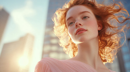 A young woman with vibrant red curls stands in a sunny urban setting, gazing upwards as sunlight illuminates her features, exuding confidence and grace amidst towering buildings.
