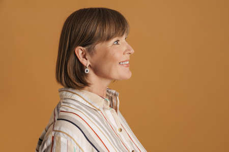 Senior woman wearing striped shirt smiling and looking aside isolated over beige wall