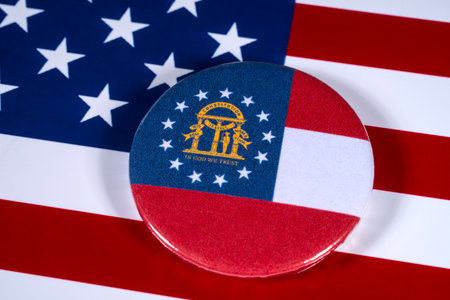 LONDON, UK - APRIL 27TH 2018: The symbol of the State of Georgia, pictured over the flag of the United States of America, on 27th April 2018.
