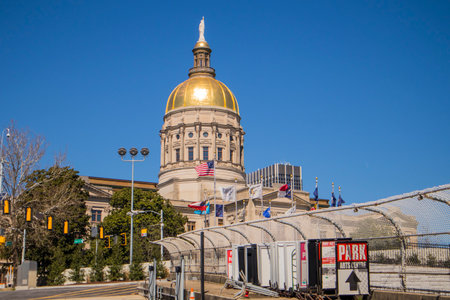 Atlanta, Ga USA - 03 07 20: Downtown Atlanta Georgia covid-19 lockdown parking signs Georgia State Capital