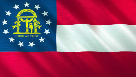 The state flag of Georgia waving in the wind on a clear day. Red, white, red stripes. Blue canton with 13 stars and coat of arms. 3d illustration render. Fluttering textile