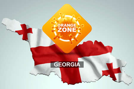 A sign with the inscription orange zone on the background of the map of Georgia with the Georgian flag. Orange danger level, , lockdown, quarantine, virus. 3d render, 3D illustration.