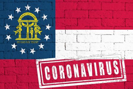 Flag of the State of Georgia painted on grungy brick wall background. with stamp CORONAVIRUS, idea and concept of healthcare, epidemic and disease in USA