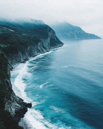 Serene coastal landscape showcases rugged cliffs and gentle ocean waves. The early morning fog enhances the tranquil atmosphere with lush greenery adorning the cliffside.