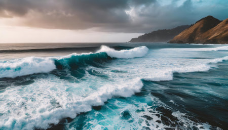 High above majestic mountain, waves break on rocky coastline generated by artificial intelligence