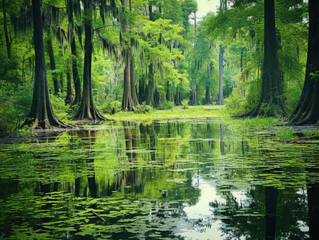 the swamp, captured in this charles white-inspired photograph, showcases a lush expanse of vegetation reminiscent of national geographic's stunning imagery. with a touch of southern gothic influence, the photo transports viewers to a mysterious and captivating world teeming with life. ai generated