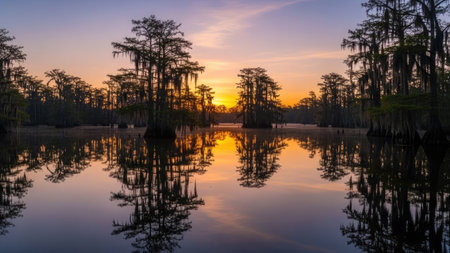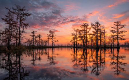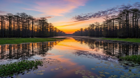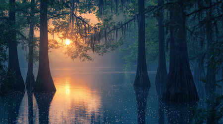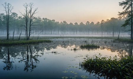 Serene swamp landscape with towering trees at sunrise