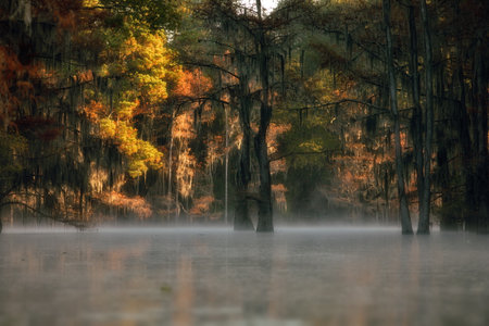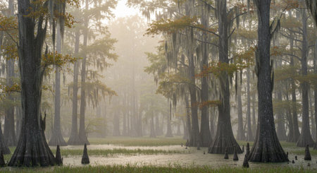 Foggy Cypress trees in the swamp at sunrise, California