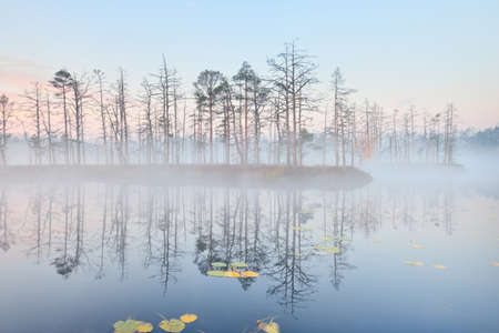 Mysterious foggy morning in the swamp. Foggy landscape.