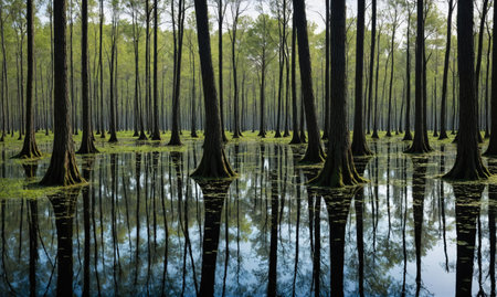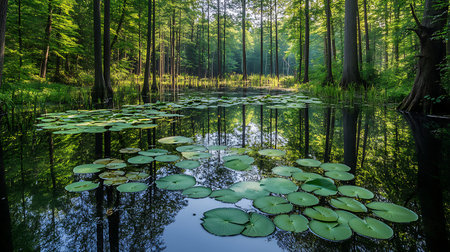 a serene view of a swampy lake surrounded by tall pine trees. the calm water reflects the greenery of the trees, creating a peaceful atmosphere. ai generated