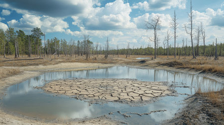 A dry pond with cracked mud, surrounded by dead trees and plants, representing the effects of drought.
