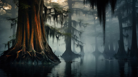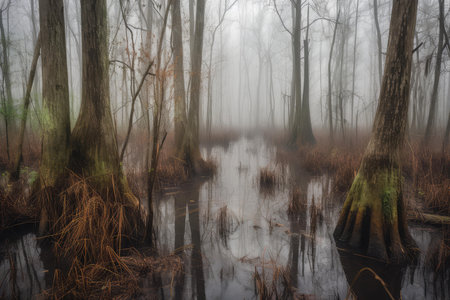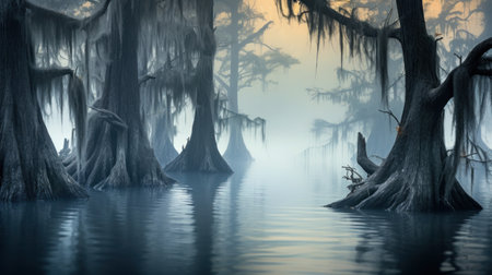 Hauntingly beautiful swamp with ghostly apparitions and mist