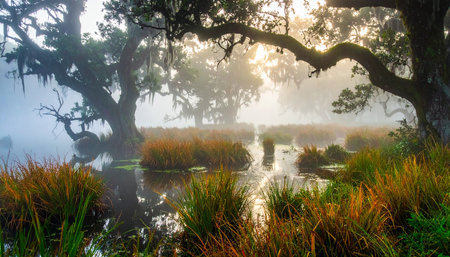 the fog blankets the marsh of west virginia, creating an ephemeral installation reminiscent of australian tonalism and the art of the ivory coast. this photograph captures the essence of new american documentary photography, with its atmospheric color washes and depiction of decaying landscapes. the uhd image showcases the intricate details of this captivating scene. ai generated