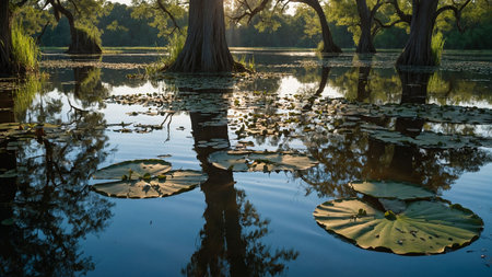 Reflection of cypress trees in the lake with water lilies