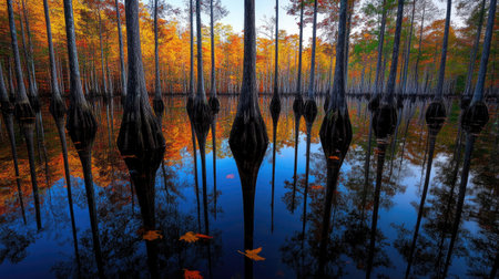A captivating autumn landscape showcasing tall cypress trees rising from a serene lake, their reflections shimmering on the water's surface.
