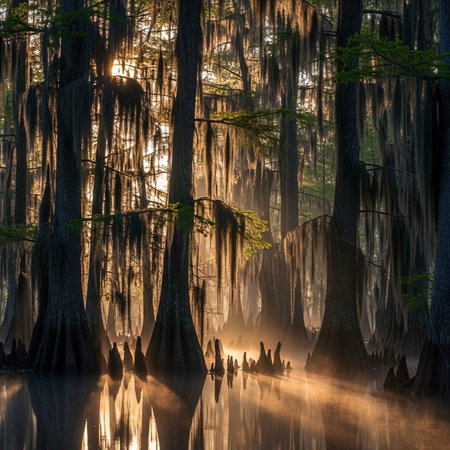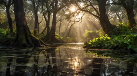 a sunny morning sunrise illuminates a decaying swamp in the southern countryside. this underexposed national geographic photo by alan lee captures the contrasting lights and darks, showcasing the essence of nature in its raw form. ai generated