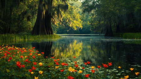 Lush greenery and colorful flowers frame the tranquil waters of the bayous in Cajun. Sunlight filters through the trees, illuminating the peaceful landscape.