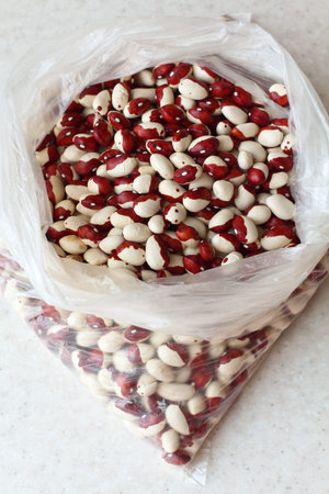 White kidney beans with red spots in the plastic bag close-up. vertical