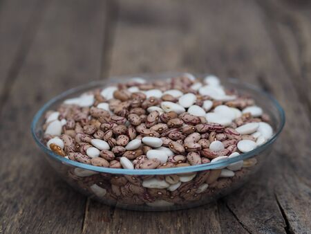 Raw pinto beans on small plate on wooden background. Healthy diet food