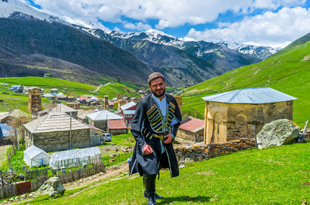 USHGULI, GEORGIA - MAY 22, 2016: The young Svan in traditional costume poses with the village on the background, on May 22 in Ushguli.