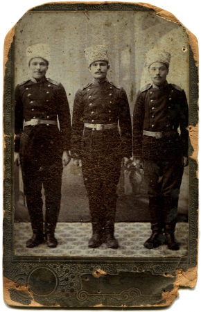 RUSSIA - CIRCA period of World War I An antique photo shows Three soldiers in full dress and fur hats, Russian Empire