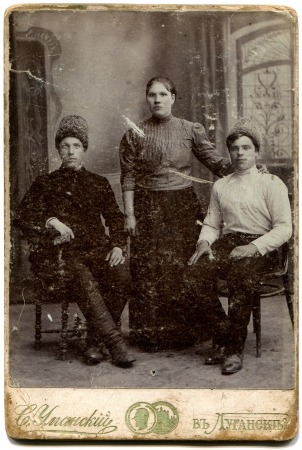 RUSSIA - CIRCA the end of XIX - early XX century An antique photo shows Two men and a woman, Lugansk, Russian Empire, now UkraineRussian text Umanskiy photographer , Lugansk