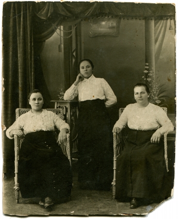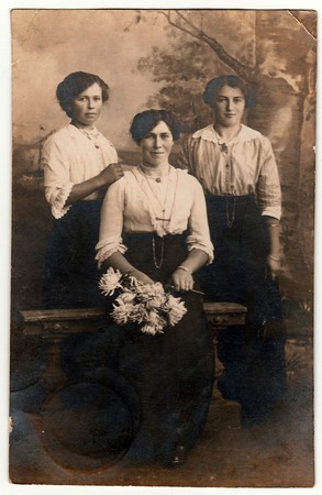 NARSDORF, GERMANY - NOVEMBER 9, 1912: Vintage photo shows three women pose in a photography studio. Black & white antique studio portrait.